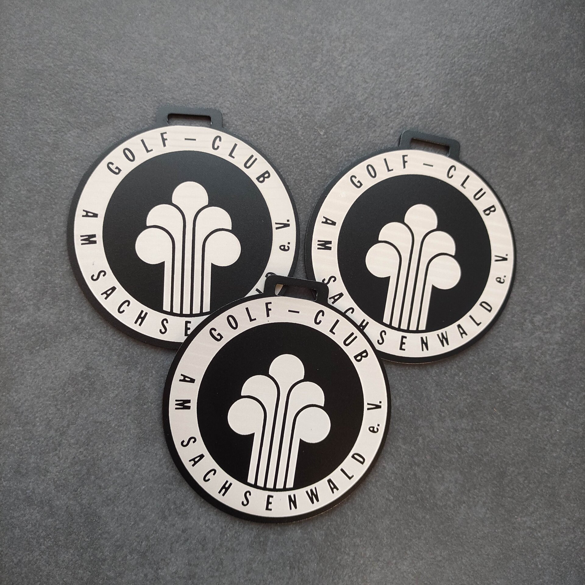 Unsere ALU line Golf Bagtags aus eloxiertem Aluminium. Das sind sehr robuste einfache Golftaschenanhänger aus Metall.