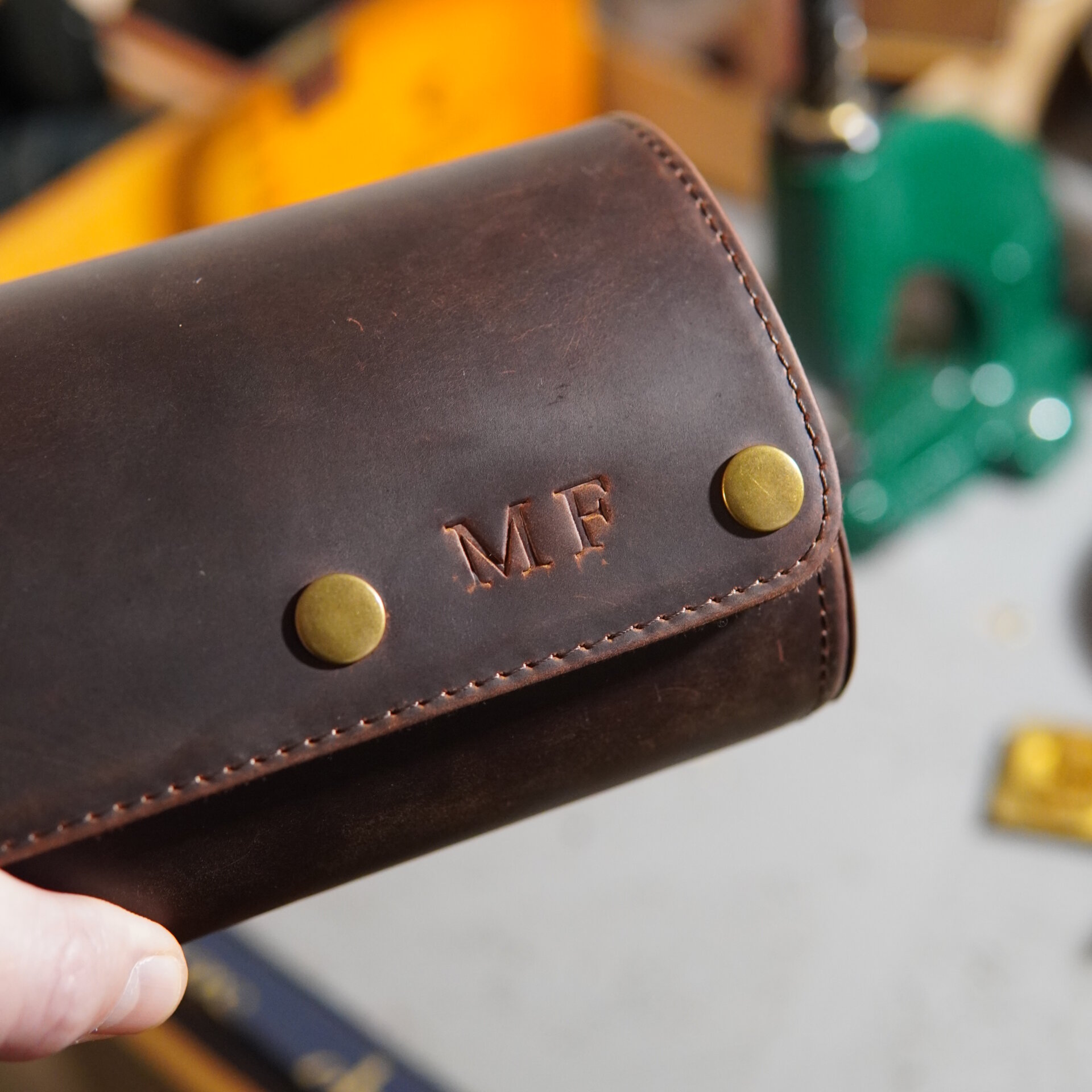5. Hochwertige Monogram-Prägung rechts auf dem Deckel. Zwischen dem dritten und dem vierten Messingdruckknopf.